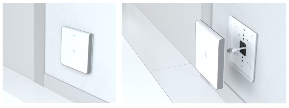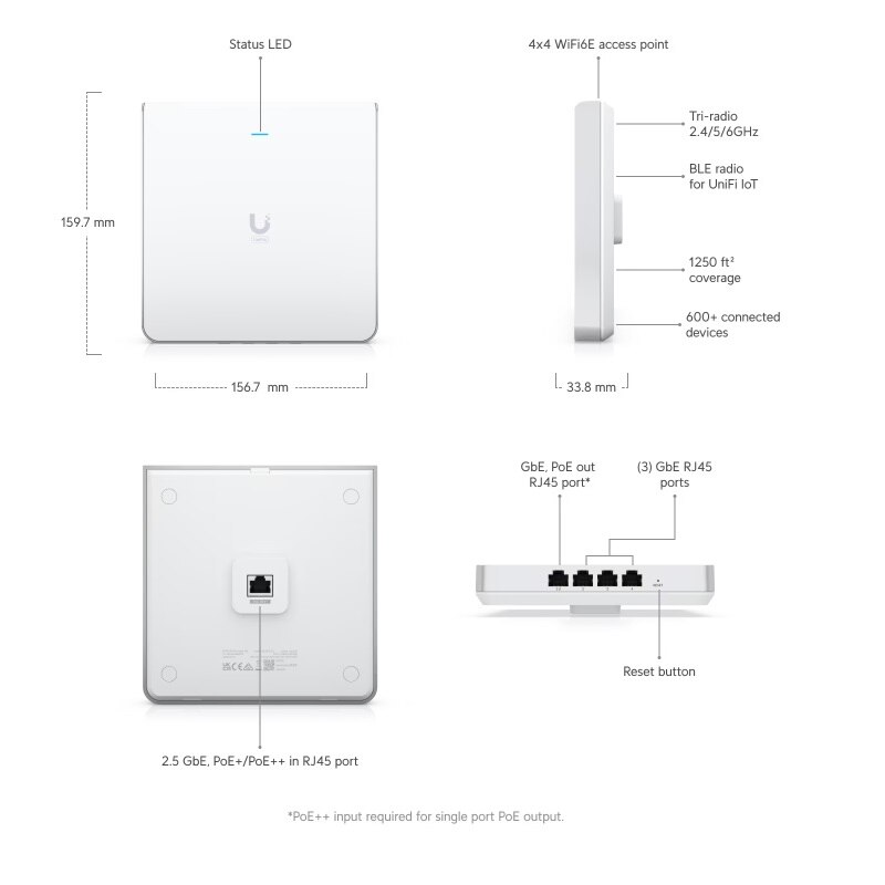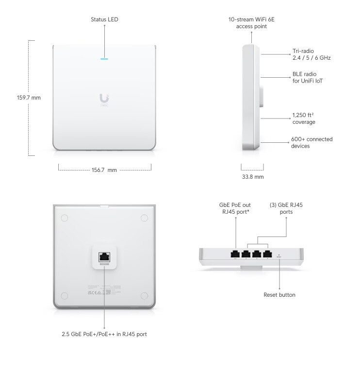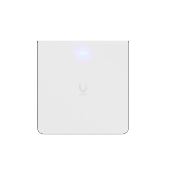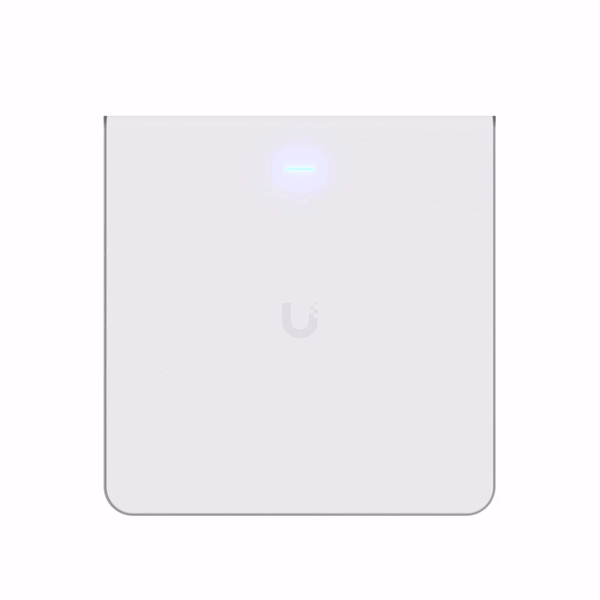 Sleek, wall-mounted WiFi 6E access point with an integrated four-port switch designed for high-density office networks.