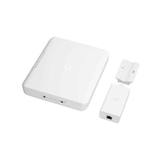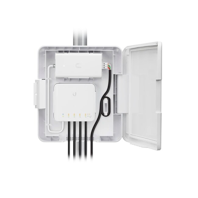 The Ubiquiti UniFi® Switch Flex Utility is an outdoor weatherproof enclosure designed for use with the UniFi Switch Flex, USW-Flex. It includes an Ethernet patch cable and a 60W PoE adapter, which provides a maximum PoE budget of 46W. The USW Flex Utility can be easily mounted on a pole, and provides clean cable management and screw lock for security.