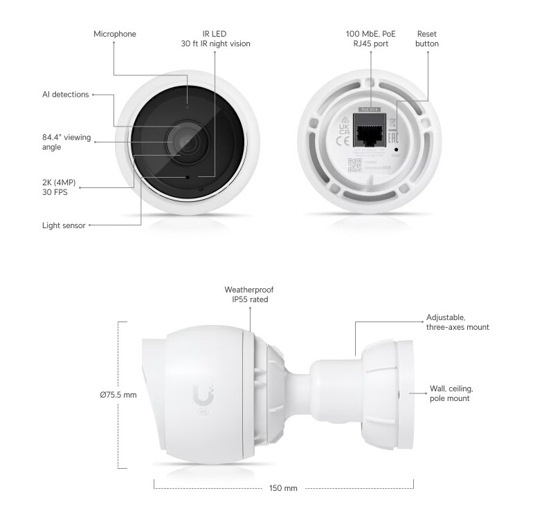 The UniFi Protect G5 Bullet Camera is a 5th generation 2K HD PoE camera for indoor or outdoor use. It features High Dynamic Range technology, that improves image details in the darkest and brightest scenes. The camera makes the picture more natural and realistic even in a wide contrast range. The Low Light function helps to improve camera performance in the nighttime. Night Vision technology provides bright images even in low-light conditions using a high-performance sensor. Managed with the UniFi Protect application: Version 2.2.7 or 2.7.18 and later (web) / 1.10.0 and later (mobile).